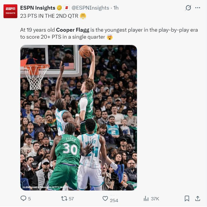 库珀-弗拉格在对阵黄蜂一战中狂揽49分10篮板3助攻1盖帽(29中20+三分5中3),他杜克蓝魔时期的队友(室友)克努佩尔三分12中8也狂砍34分,这两位天之骄子的比拼非常之精彩,但最耀眼的还是状元郎弗拉格,因为他这场比赛创造了太多、太多的纪录。